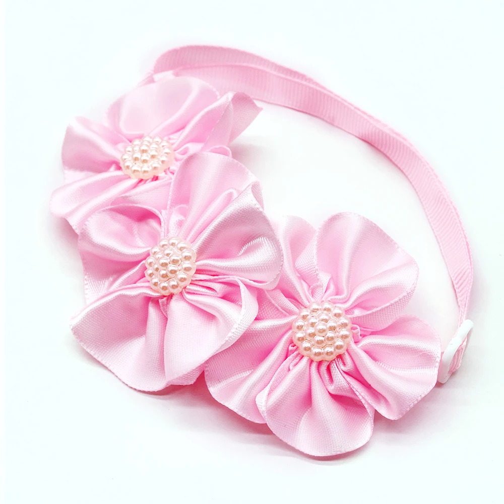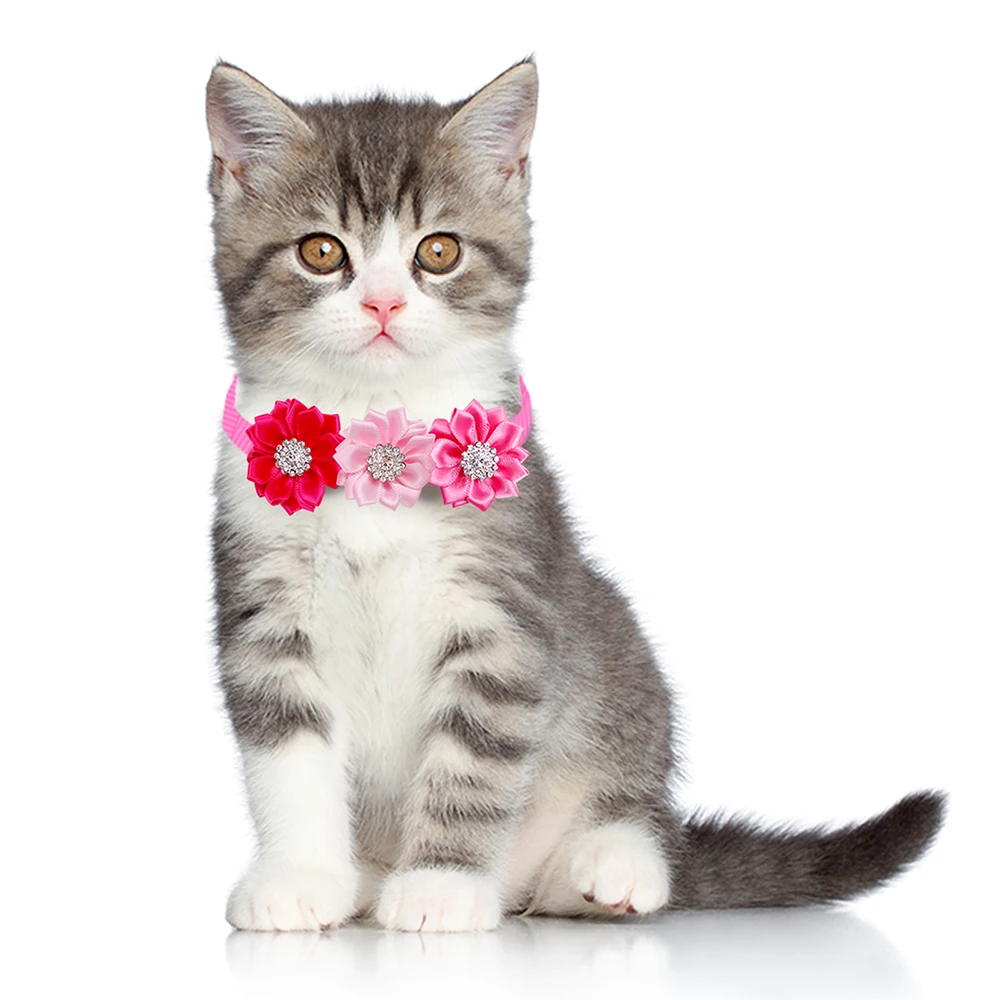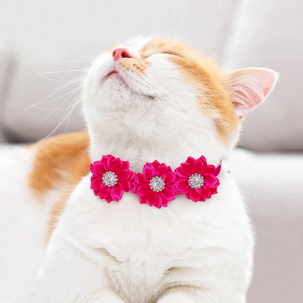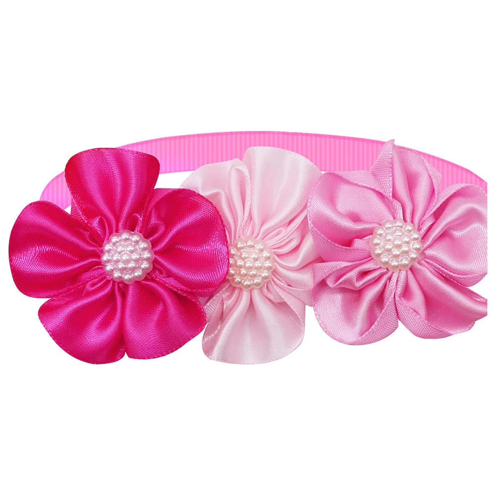 Set de 8 moños decorativos para mascotas en color rosa, fabricados en chiffon, con diseño floral y detalle central tipo diamante. Accesorios ligeros y cómodos, adecuados para gatos y perros pequeños a medianos. Ideales para grooming, sesiones fotográficas, eventos especiales o venta al por mayor.