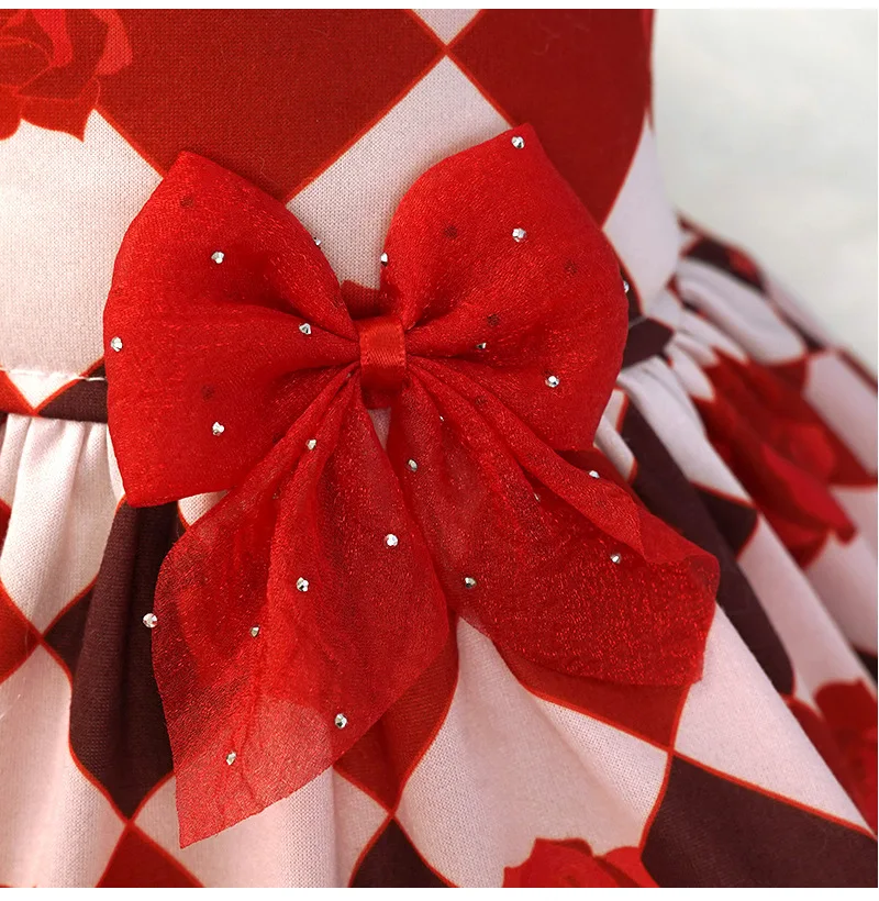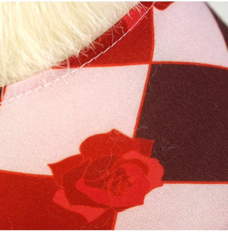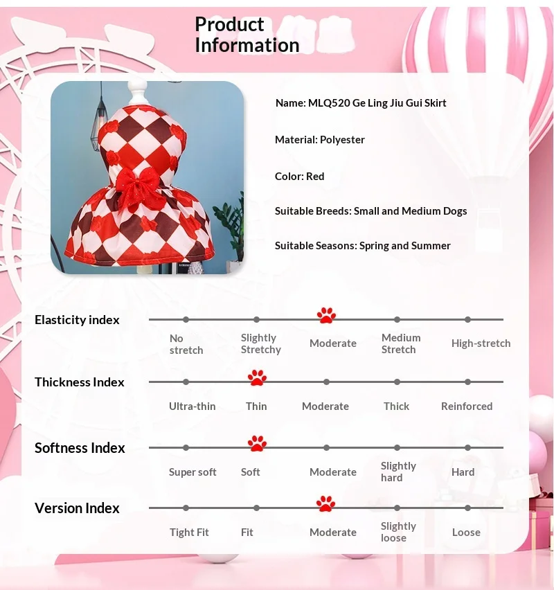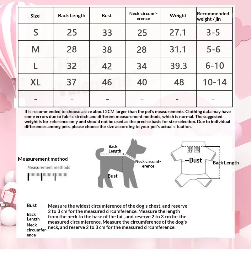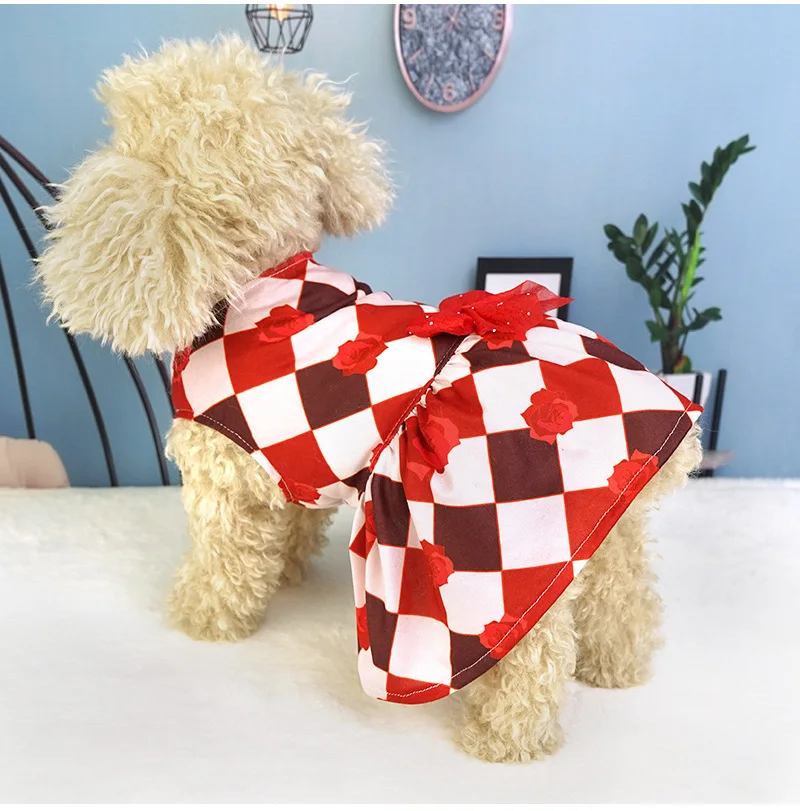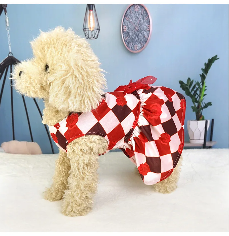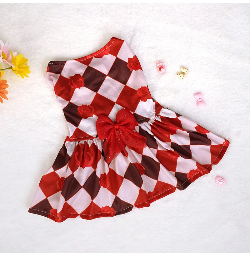 Vestido para mascotas con estampado temático de San Valentín, confeccionado en 100% fibra de poliéster, adecuado para la temporada de otoño e invierno. Diseño con falda y moño decorativo, indicado para perros pequeños y uso ocasional en fiestas, bodas, sesiones fotográficas y celebraciones de Año Nuevo.