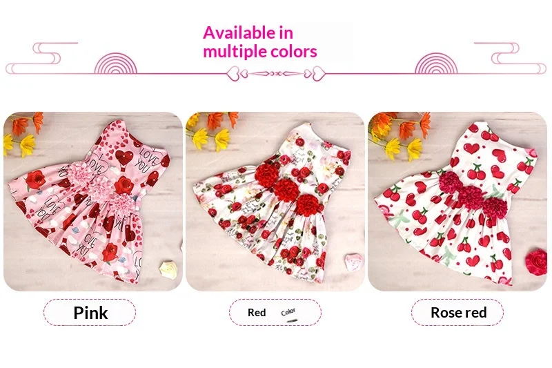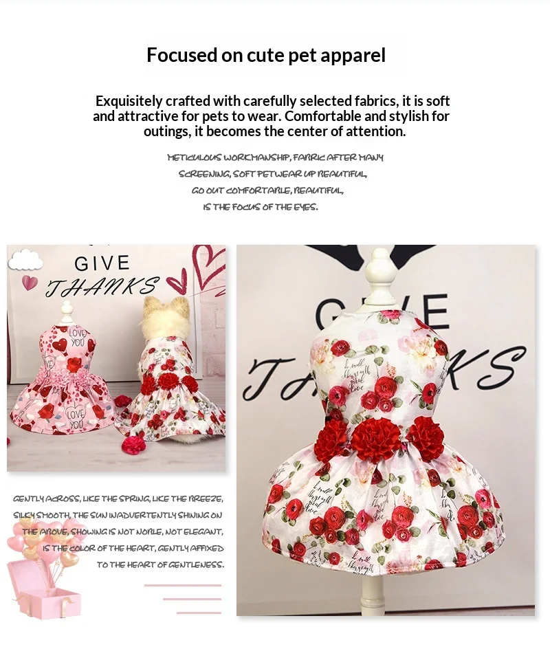 Vestido para perros y gatos, con estampado de rosas rojas, cerezas y corazones, ideal para fiestas, reuniones, sesiones fotográficas y celebraciones como San Valentín. Su diseño sin mangas permite mayor comodidad y libertad de movimiento.