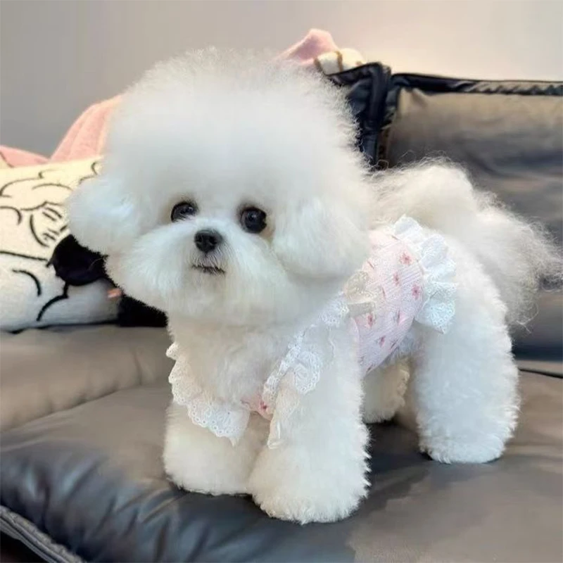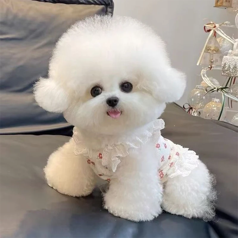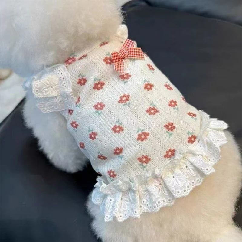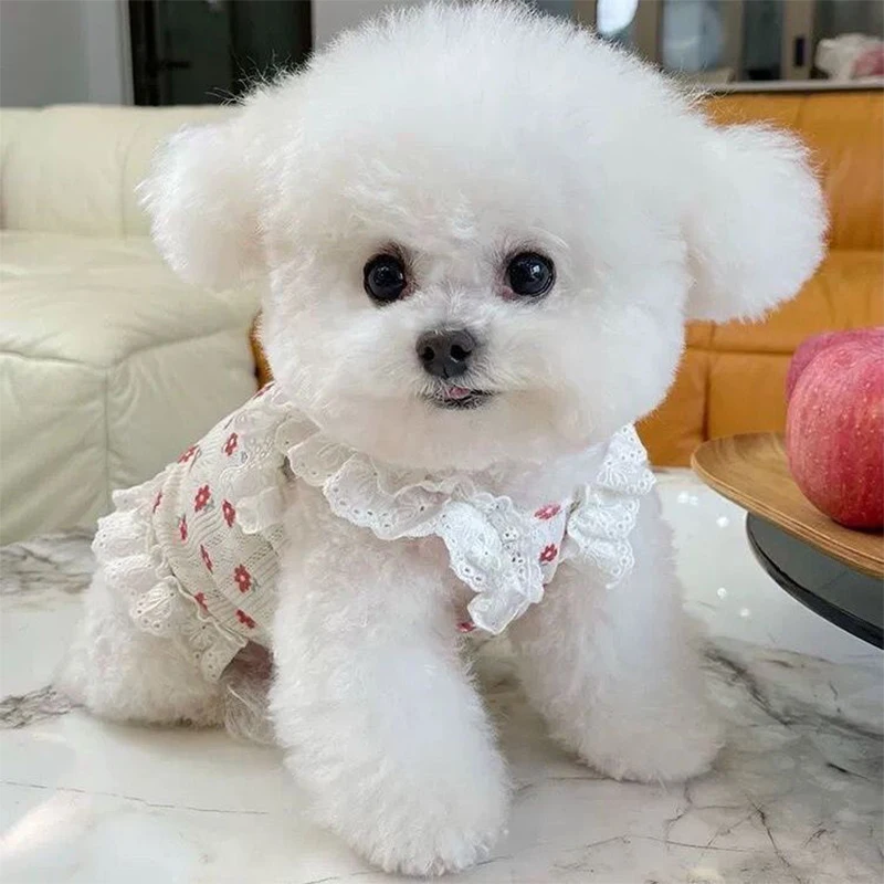 Dale a tu mascota un look tierno, fresco y elegante con este vestido de verano con tirantes de la marca Abrrlo. Su estampado floral, moño decorativo, detalles de encaje y mangas tipo alas crean un estilo adorable, ideal para paseos, vacaciones y sesiones de fotos.