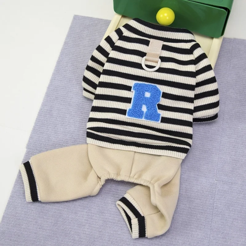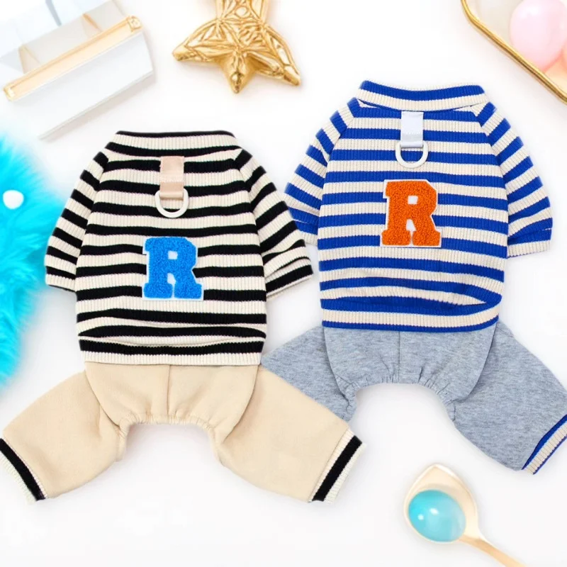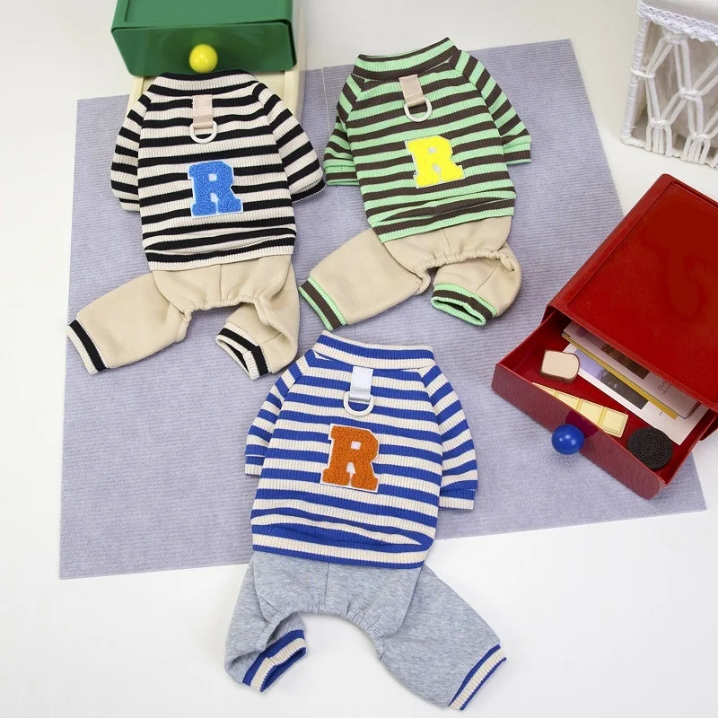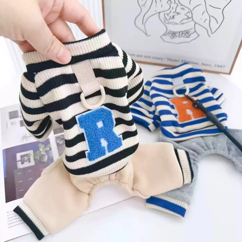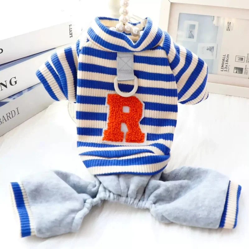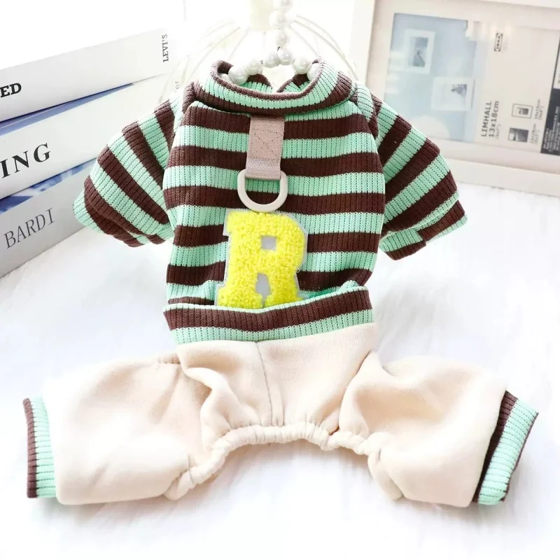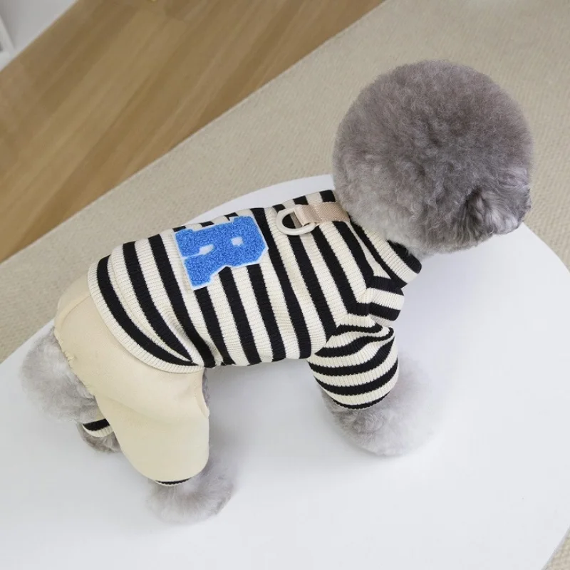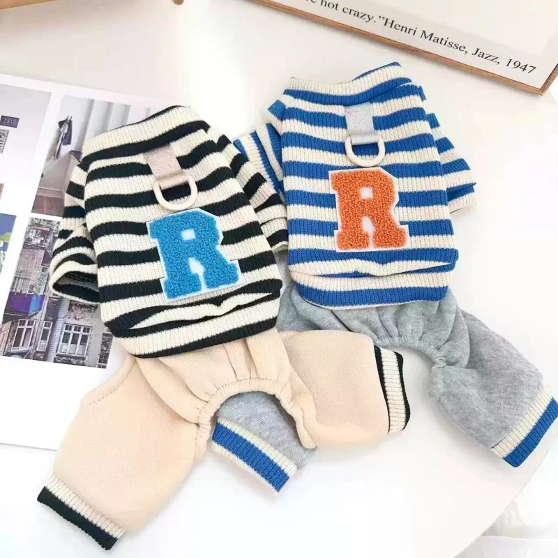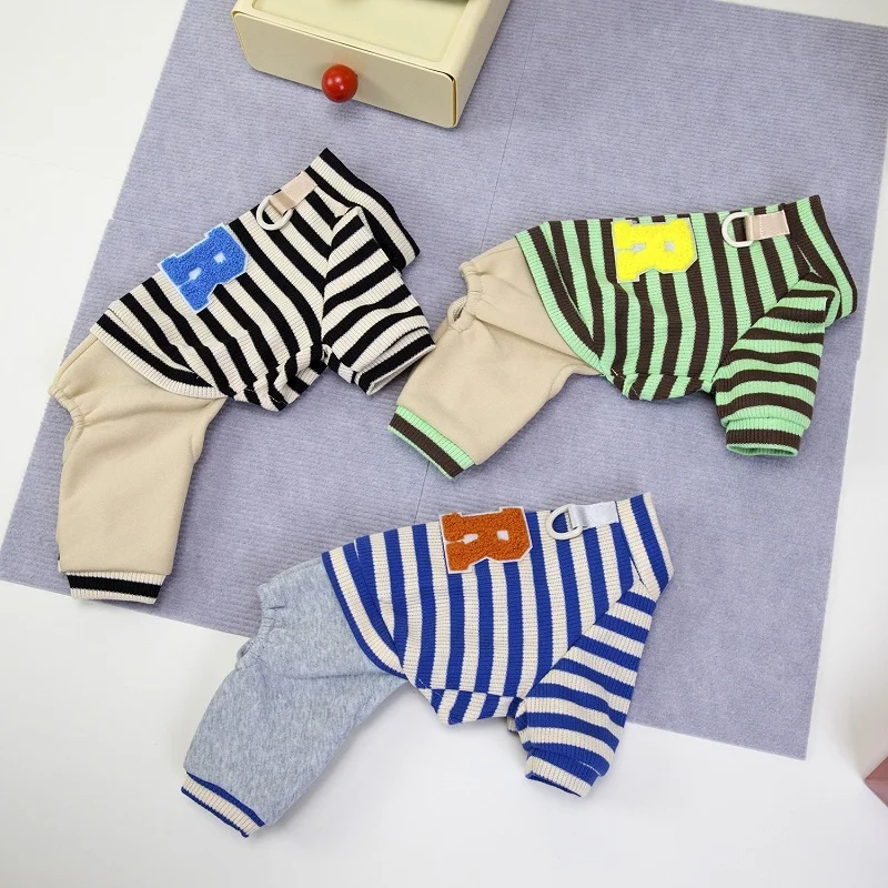 Overol cálido y moderno para perros y gatos, ideal para la temporada de invierno. Su diseño a rayas con estampado de letras combina estilo y comodidad, perfecto para paseos, descanso o uso diario.