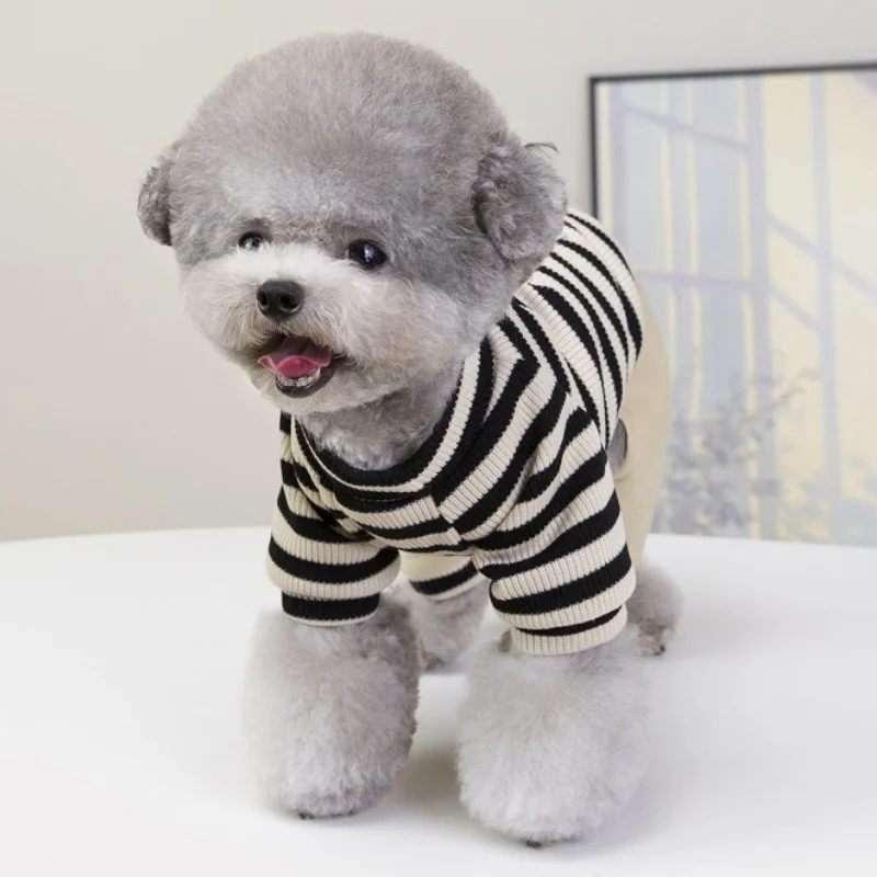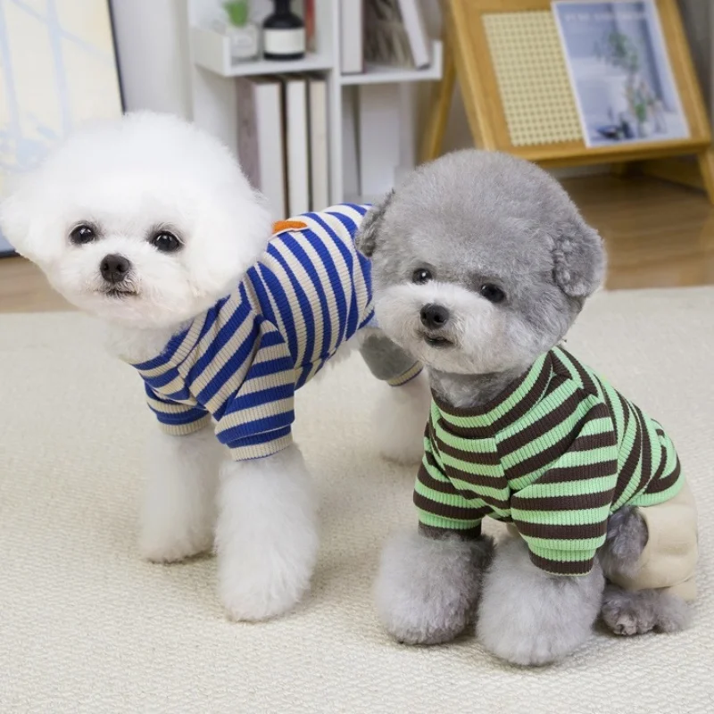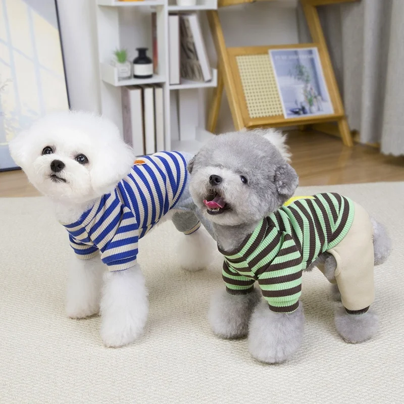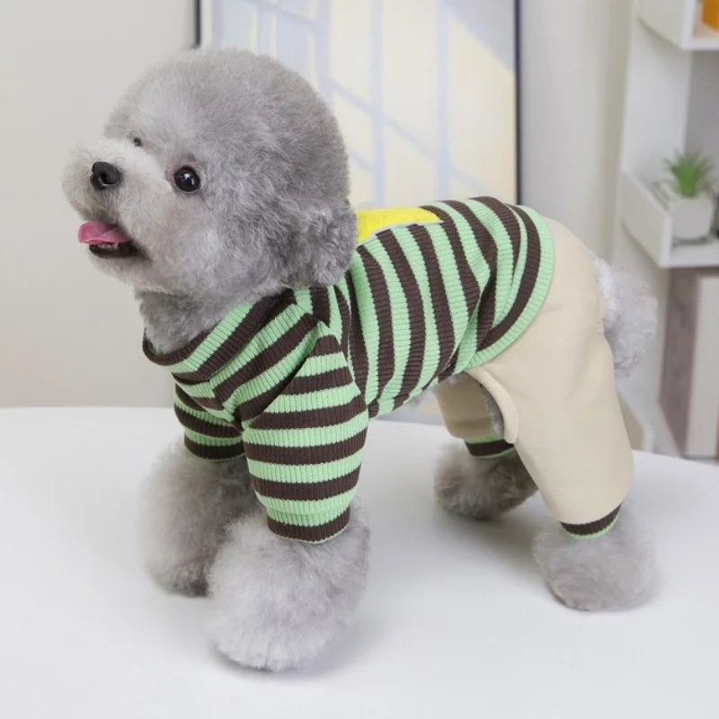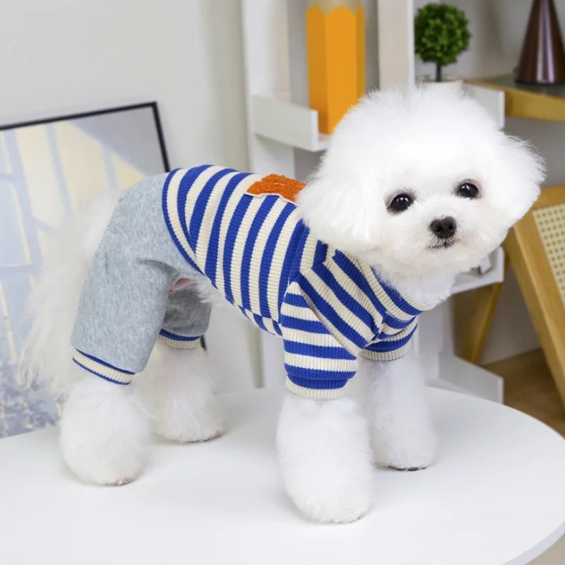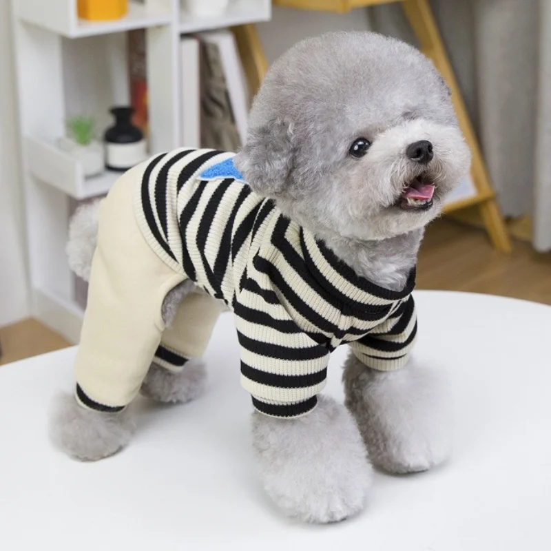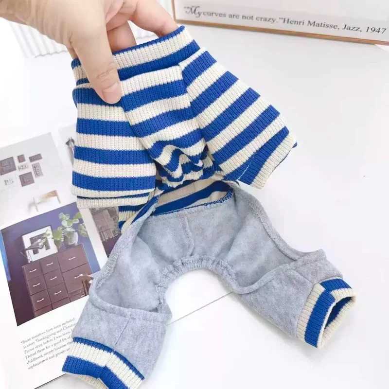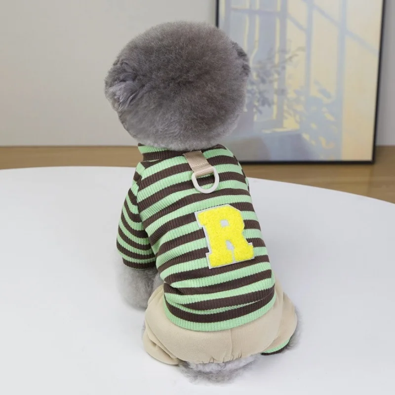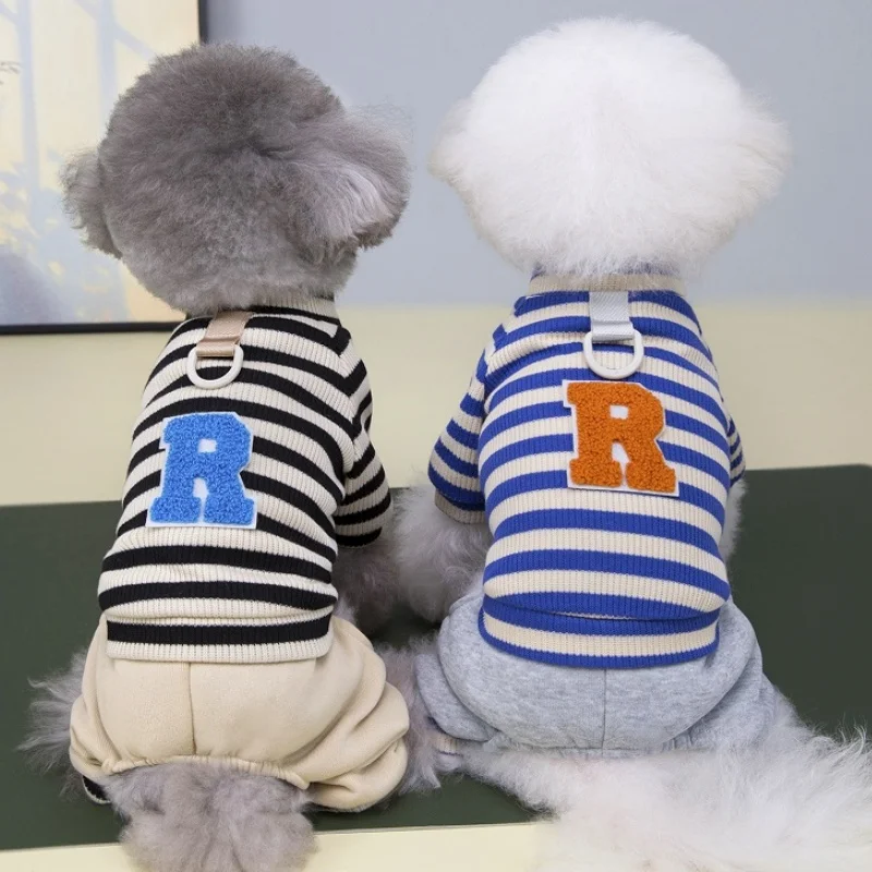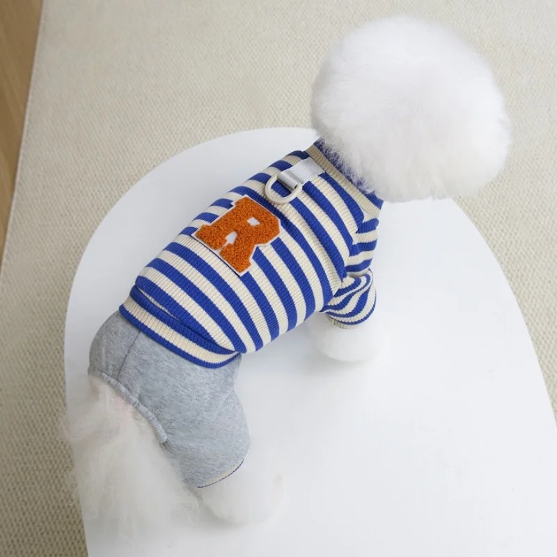 Overol cálido y moderno para perros y gatos, ideal para la temporada de invierno. Su diseño a rayas con estampado de letras combina estilo y comodidad, perfecto para paseos, descanso o uso diario.