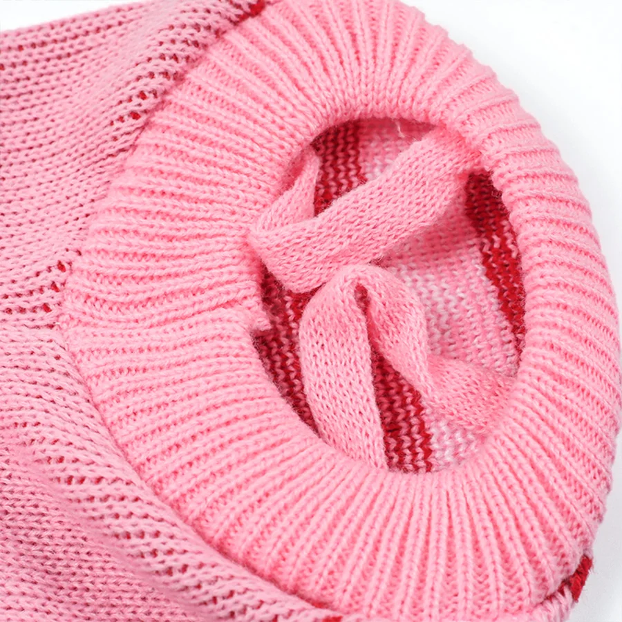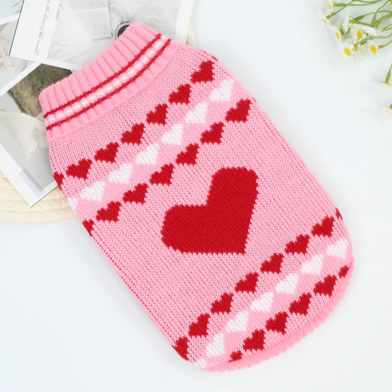 Suéter para mascotas en color rosa, con estampado de corazones, diseñado para perros pequeños y gatos. Cuenta con cuello alto tipo turtleneck y diseño pullover, adecuado para las temporadas de primavera y otoño. Fabricado en material de fibra, cómodo y transpirable para uso diario o eventos especiales.